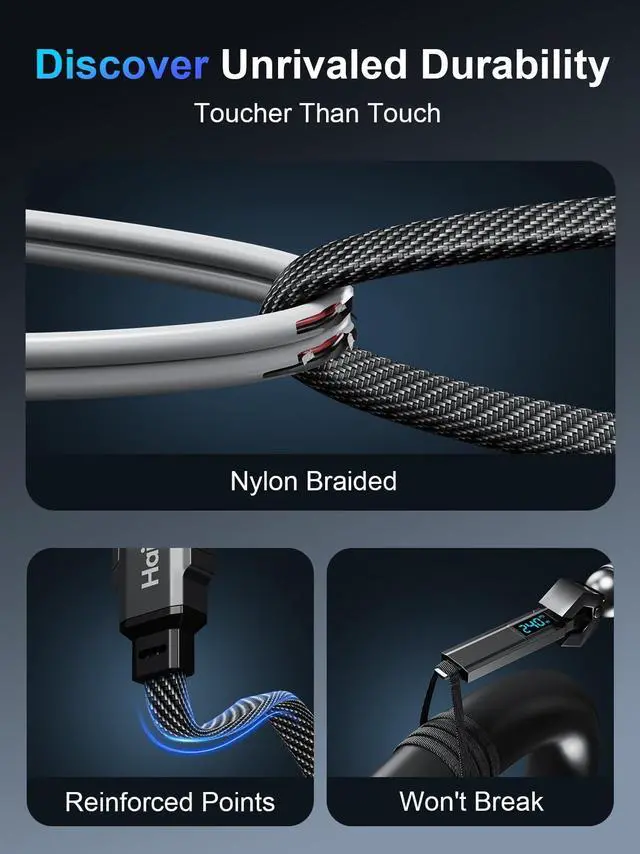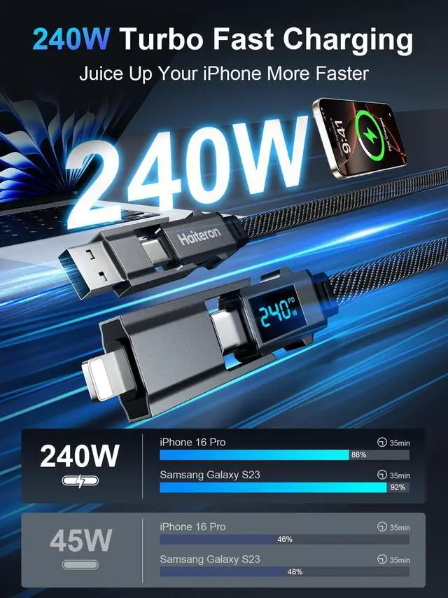 - [The Complete Package: Reliable Cable & Haiteron Support] You get one 5-foot (1.5m) Haiteron 240W 4-in-1 Charging Cable the perfect versatile length. Plus, enjoy the confidence of Haiteron's reliable 24/7 customer support. Got questions or issues? Contact us anytime, and we'll respond within 24 hours to make it right.