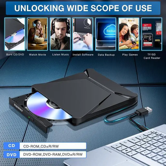 with this external CD/DVD RW Drive, you can read movies DVDs, play music CDs, burn and rip discs, copy photos, install software/games/system, backup data and more. and just slips easily into your travel bag, perfect companion for DVD lovers, using everywhere.