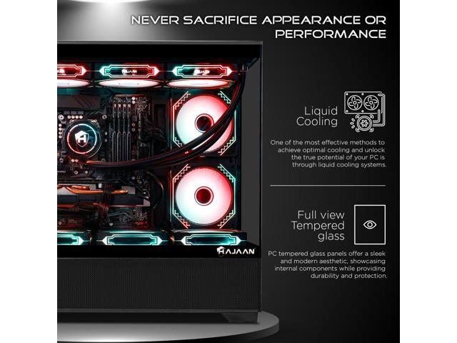Liquid cooling system keeps internal components at optimal temperature for lasting performance and efficiency. Illuminate your gaming setup with RGB case lighting and showcase a futuristic look through front and side panel tempered glass on the PC.