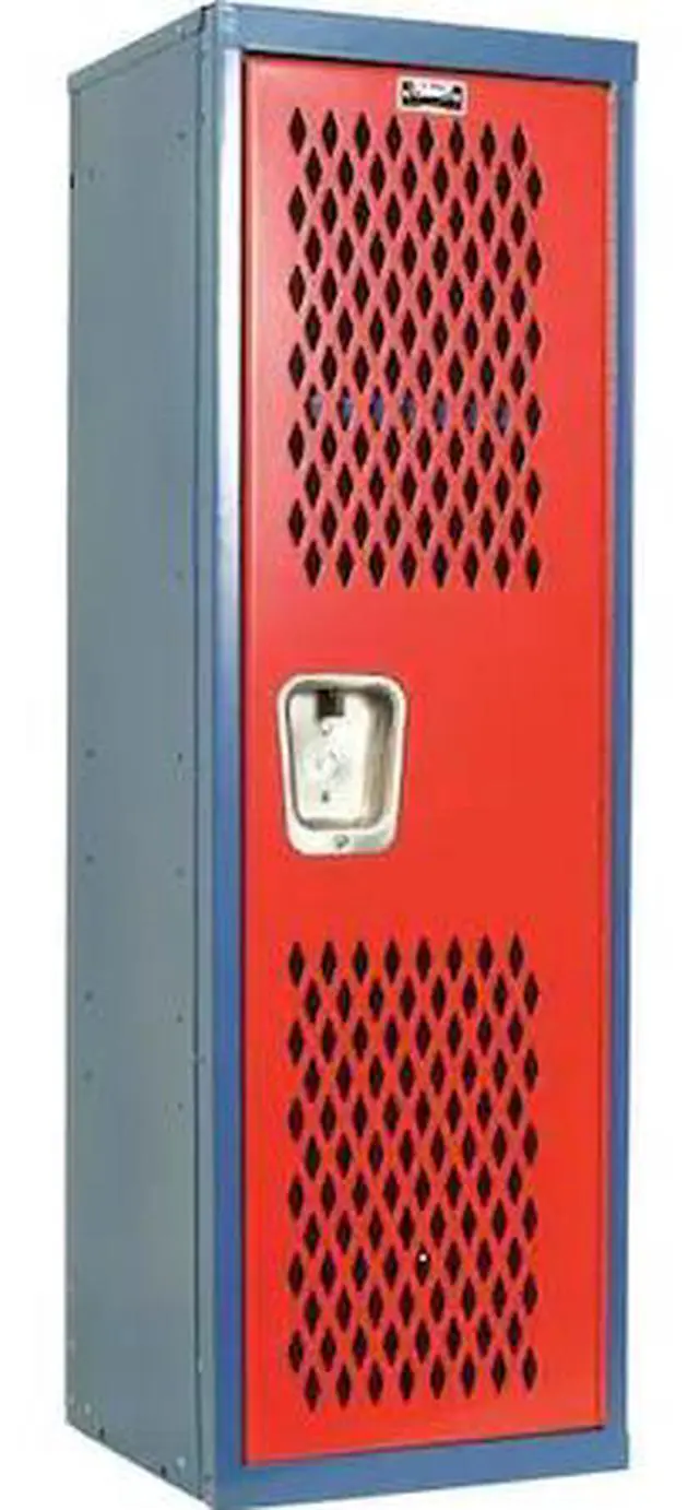 Wardrobe Locker, Audit Trail Storage None, Frame Assembled Unassembled, Number of Tiers 1, Number of Units Wide 1, Door Type Ventilated, Frame Material Thickness 16 ga, Includes Number Plates Yes, Locker Color Red/Blue, Lock Type Padlock Hasp, Overall Depth 15 in, Overall Height 48 in, Overall Width 15 in, Handle Type Recessed Lift, Locker Finish Powder Coated, Locker Material Steel, Opening Depth 14 in, Opening Height 48 in, Opening Width 12 1/4 in, Panel Material Thickness 24 ga. This item has been restricted from sale in the following state (s): []