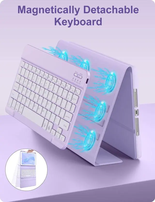 Features 1.Keyboard case compatible with ipad 9th generation 10.2" 2021/compatible with ipad 8th generation 10.2" 2020/compatible with ipad 7th generation 10.2" 2019/compatible with iPad Air 3 10.5" 2019/compatible with iPad Pro 10.5" 2017. 2.Multiple 7 color backlit bring you different visual enjoyment and comfortable typing experience. You can choose color what you like. 3.You can turn your tablet into a highly performance laptop in seconds. Make you look and feel very professional. 4.You can position the tablet however you want to view your screen. The case enable you to position the tablet comfortably, regardless of where/how you are sitting. 5.The pencil holder is on the top, it is different from others that the pencil holder is on the bottom. More easier to place and remove your pencil. 6.Precise cutouts allow full access to all features and offer the all-round protection, convenience for daily use. 7.Keyboard are comfortable for typing, suitable for students and workers. 8.The keyboard featured detachable design, it allows you to typing, reading, painting, viewing. 9.This keyboard case is very slim. Its good for you work and travel because you do not have to get your laptop with you. How to connect the keyboard? 1.Turn on the keyboard. 2.Press connect button at keyboard, paring indicator flashes blue. 3.Turn on the BT at your tablet Settings. Find the BT 3.0 Keyboard and select it, it will connect automatically.