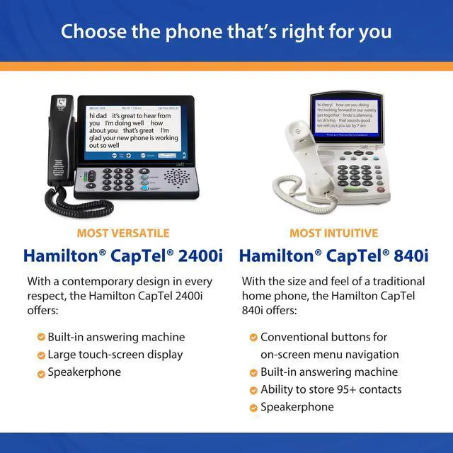 ![]() Hamilton CapTel 840i Captioned Telephone (756-002600-HAM) | ![]() Hamilton CapTel 2400iSPNBT Captioned Telephone Large Touch-Screen Captioned T... | |