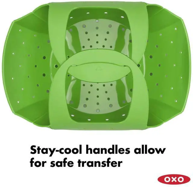 • High walls keep contents contained and away from boiling water, while stay-cool handles allow for stable transfer