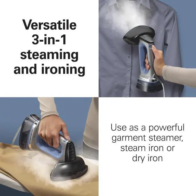 With the Hamilton Beach Durathon 3-in-1 Steamer/Iron, you get 3 appliances in one: a powerful garment steamer, steam iron and dry iron.