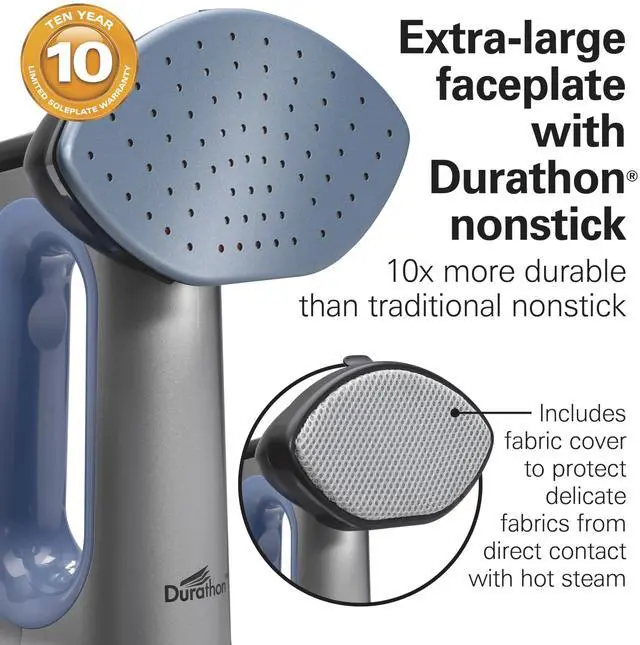 The nonstick faceplate has 2 angled corners that easily reach into tight areas and in-between buttons. Its Durathon nonstick coating provides a smooth glide and is 10 times more durable than traditional nonstick. To iron delicate fabrics and protect them from direct contact from hot steam, attach the included fabric cover.