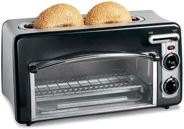 | Features | Compact 2 in 1 appliance Top slot works like a traditional 2 slice toaster Oven fits two 16 pizza slices or two personal pizzas 1.5" toasting slot fits thick breads Electronic toast shade and oven temperature controls for consistency Removable crumb tray and automatic toaster shuttoff for convenience |
