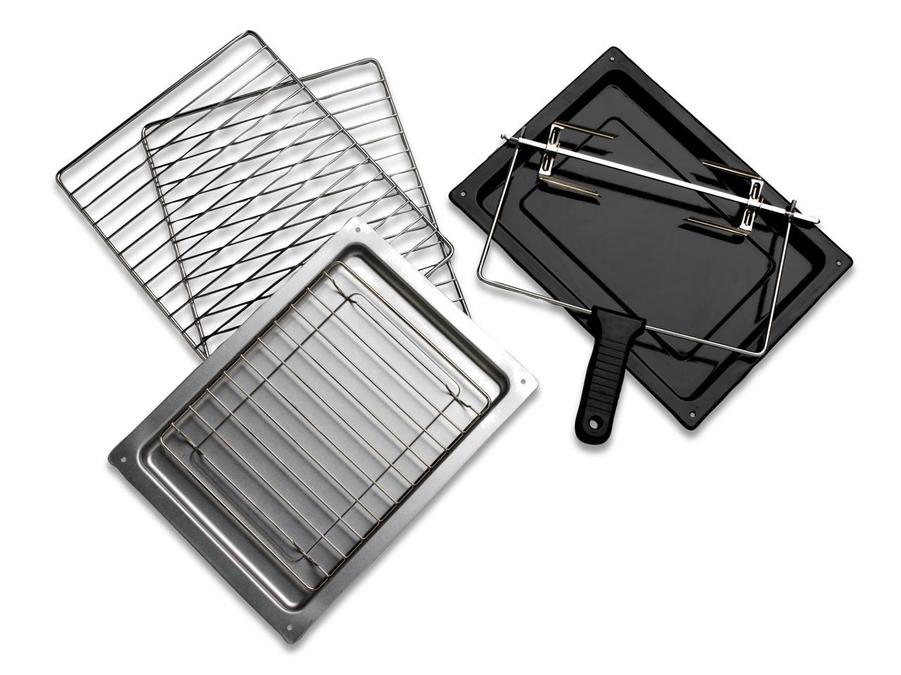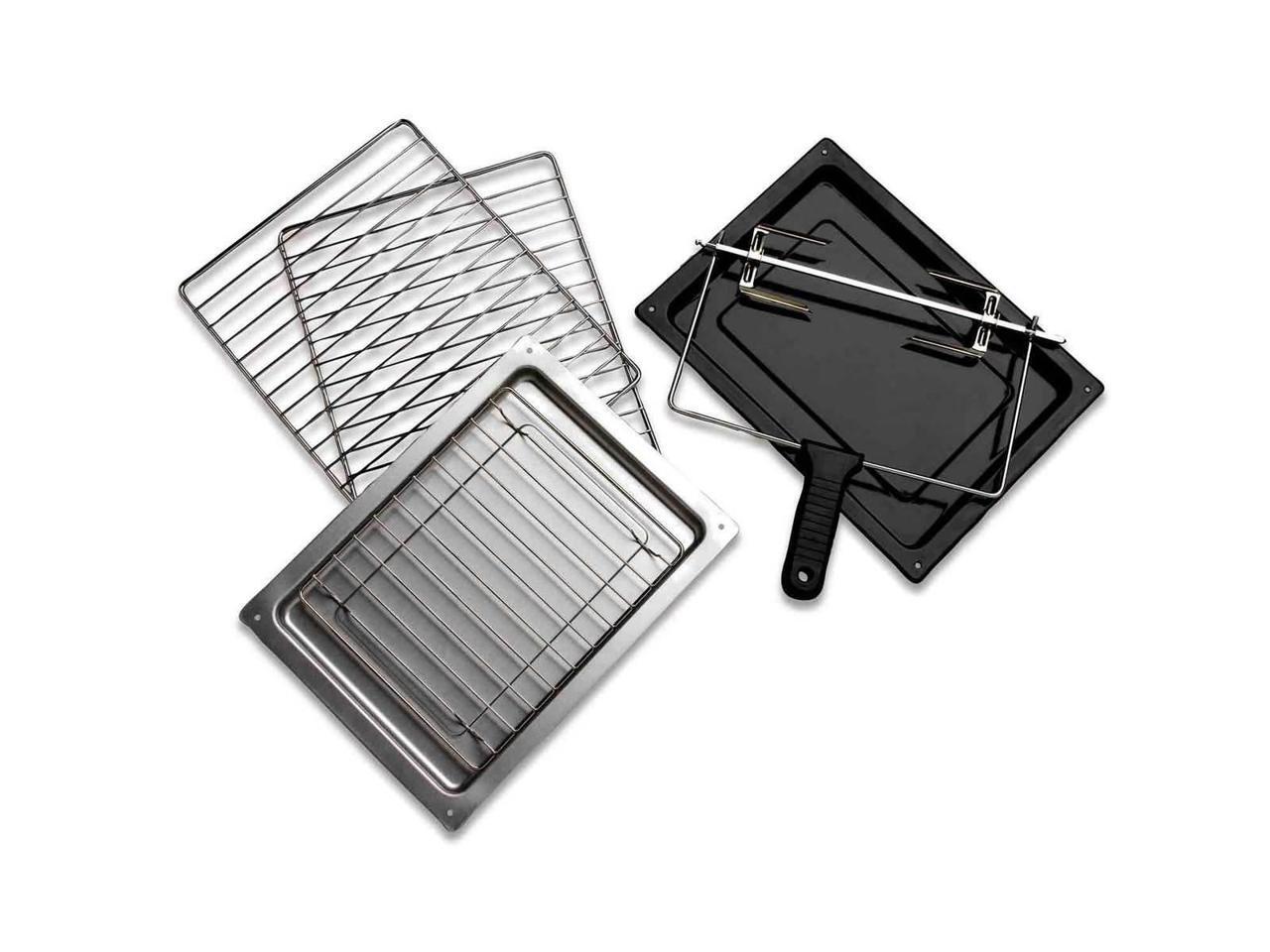 Includes 2 cooking racks, 2 baking pans, broiler rack & rotisserie accessories