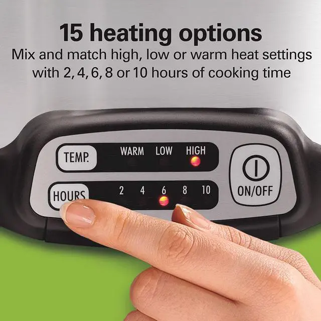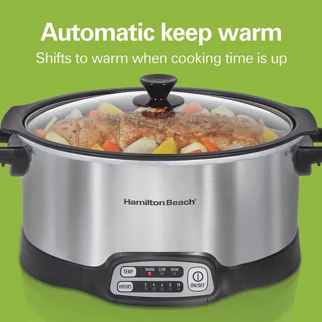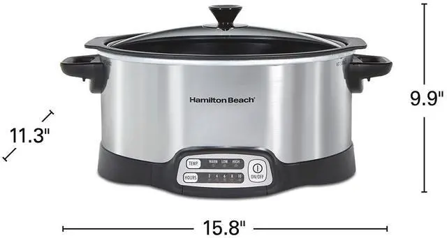 Hamilton Beach stovetop sear & Cook programmable slow cooker has everything you need to create homemade, delicious meals on your schedule. Sear meat on your stovetop to lock in flavor, and then finish the meal in the slow cooker. Removable nonstick aluminum pot cooks directly on gas, electric, or ceramic stovetops and is oven safe. With more programming options than a Crock-Pot Smart-Pot slow cooker, mix and match temperature settings with your choice of cooking times. Choose from 2, 4, 6, 8, or 10 hours of cooking time and high, low, or warm temperature settings. The 6-Quart oval crock is the perfect size for a 6 lb. Chicken or 4 lb. Roast. Both pot and lid are dishwasher safe for easy cleanup.