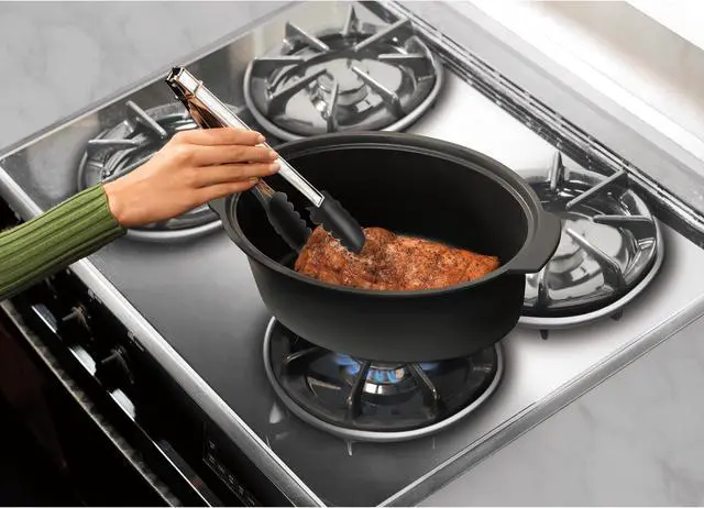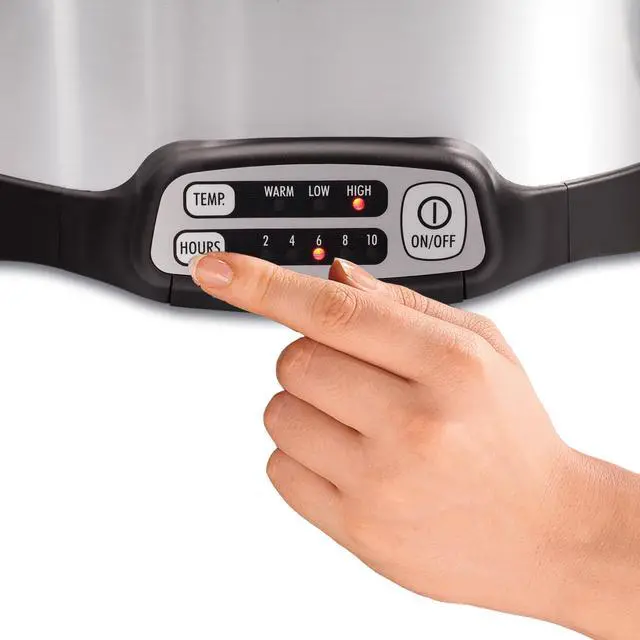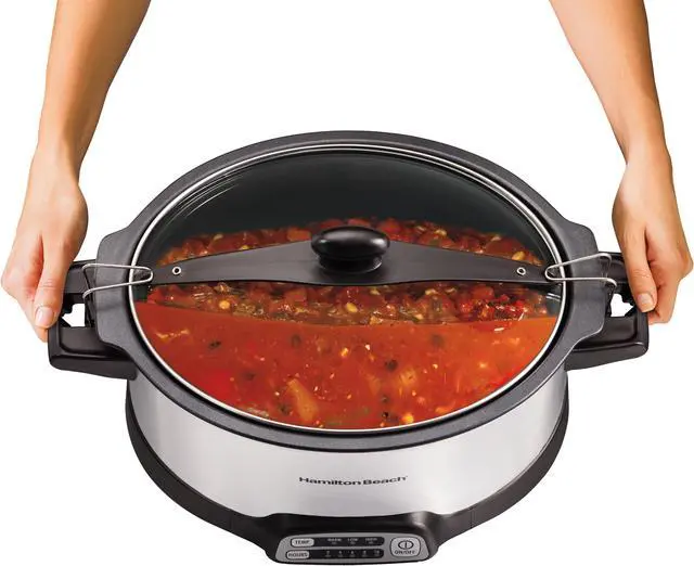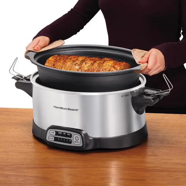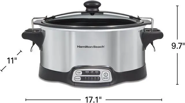 | Features | The Hamilton Beach Hamilton Beach® Stay or Go® Sear & Cook Slow Cooker has everything you need to create homemade, delicious meals for 7 or more people. Sear meat on your stovetop to lock in flavor, and then finish the meal in the slow cooker. The removable nonstick aluminum pot cooks directly on gas, electric or ceramic stovetops and is oven safe. Choose from 15 heating options with 2, 4, 6, 8 or 10 hours of cooking time and high, low, or warm heat settings. It lets you mix and match the temperature settings with your choice of cooking times. The clip-tight sealed lid locks onto slow cooker to help prevent messy spills during travel. The 6 quart oval pan serves 7 or more people and is the perfect size for a 6 lb. chicken or 4 lb. roast. Both the pan and lid are dishwasher safe for easy cleanup. Lock in the flavor — sear right on the stovetop Sear on the stovetop, then finish the meal in the same pot. The removable nonstick aluminum pot cooks directly on gas, electric or ceramic stovetops. 15 heating options Mix and match high, low or warm heat settings with your choice of 2, 4, 6, 8 or 10 hours of cooking time. Clip-tight sealed lid helps prevent messy spills Take your slow cooker to parties or on the road with worrying about messy spills. The clip-tight sealed lid locks onto the slow cooker to improve portability. Serves 7+ people This programmable slow cooker's 6 quart capacity is the perfect size for a 6 lb. chicken or 4 lb. roast. Cook a hearty meal for the whole family or serve a delicious main dish on your buffet for the holidays. Automatic keep warm When your cooking time is up, this 6 quart slow cooker automatically shifts to warm to keep food at the perfect temperature until serving time. |