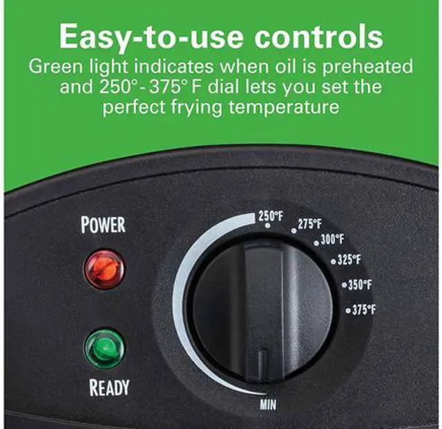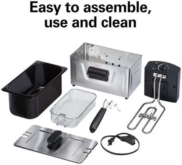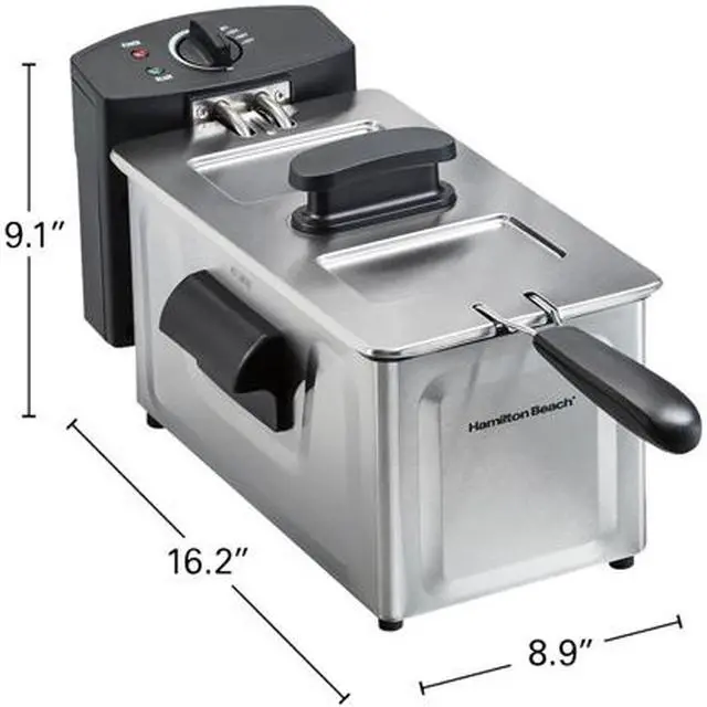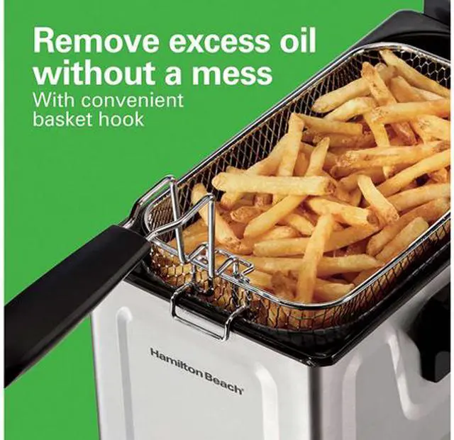 | Features | With the Hamilton Beach 8 Cup Deep Fryer, you can fry up to 6 cups of restaurant-quality chicken, fries or onion rings in the comfort of your own home. You'll find it easy to use, even if you've never attempted to deep-fry food before. Simply preheat the oil until the green ready light comes on, fill the basket with food without overcrowding it, lower the basket into the oil and cover with the lid. When food is finished frying, hook the basket over the oil tank to easily remove excess oil from your food. For easy cleaning, the enamel-coated oil tank, cooking basket and lid are dishwasher safe. For added convenience when you're frying, the magnetic cord easily detaches from the deep fryer to prevent tipping. Family-size capacity cooks up to 6 cups of food Remove excess oil without mess Make restaurant-style fried food minutes Easy to assemble, use and clean Magnetic cord easily detaches to prevent tipping Easy-to-use cooking controls |