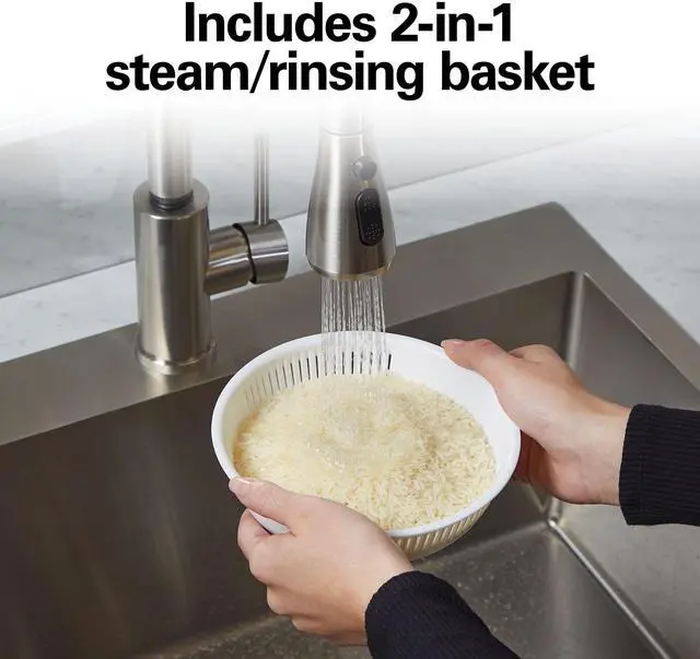 - Versatile steam basket on the cooker doubles as a colander for rinsing rice or vegetables