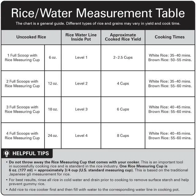 * This appliance holds 8 cups of cooked rice or 4 cups of uncooked rice. One rice measuring cup equals 6 oz. (177 g) or approximately 3/4 cup U.S. dry measure. This is based on the traditional Japanese go measurement.