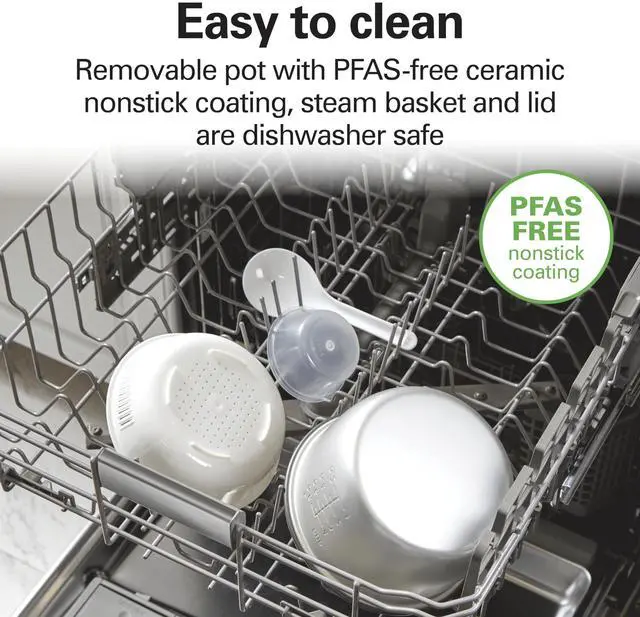 The removable PFAS-free nonstick coated pot and the steam/rinsing basket are both dishwasher safe for easy cleanup.