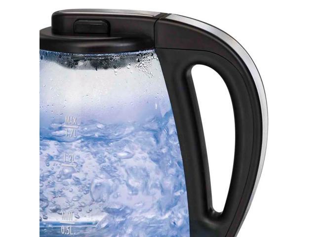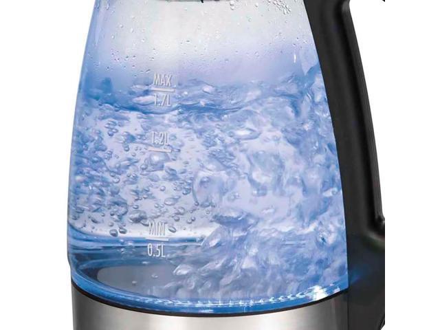- This glass electric kettle looks great on the kitchen countertop. Blue LED lights on the kettle illuminate when water is heating for a soft blue glow.