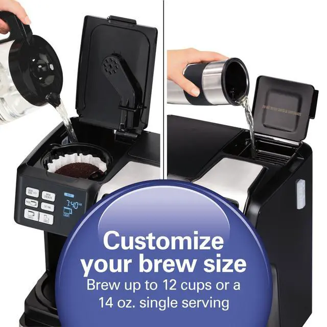 Brew up to 12 cups using your favorite ground coffee on the carafe side or brew a single serving with a pod or coffee grounds on the other. You can brew up to 10 oz. cup of coffee using a pod, or fill a 14 oz., 7-1/4" tall travel mug when you use coffee grounds.