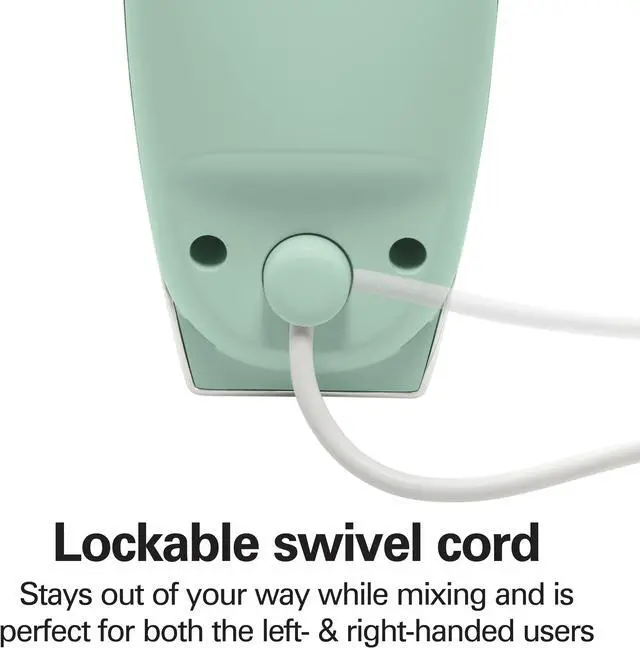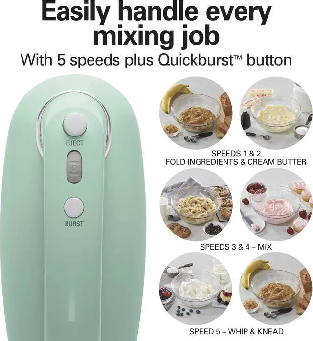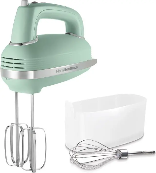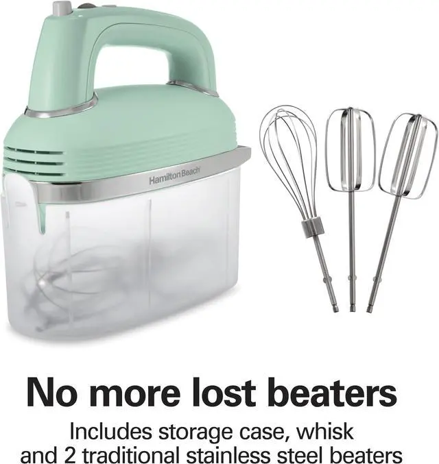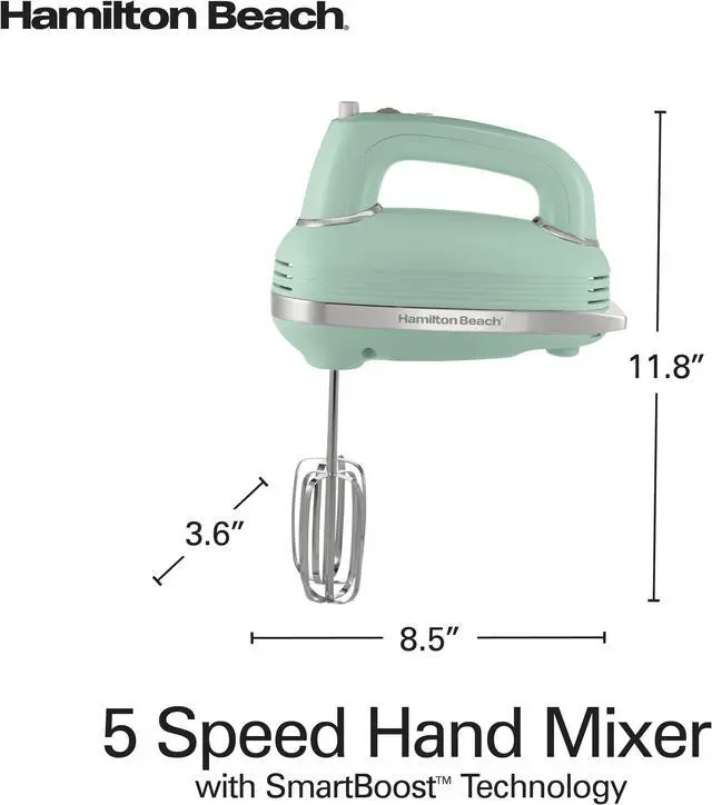 | Features | The Hamilton Beach® 5 Speed Hand Mixer with SmartBoost™ Technology honors the company's 70-year history of making hand mixers. Like our vintage hand mixers from the 1950s, this heritage-inspired mixer will help you bake and create delicious recipes for the ones you love. Since this hand mixer has 5 speeds, you'll be able to mix, fold and whip with ease. For powerful mixing and control, it features a DC motor with SmartBoost™ technology, so you can easily prepare everything from cookie dough and cake batter to mashed potatoes. To reduce messy splatters, this hand mixer is equipped with Slow Start™ technology, which is nearly half as slow as the starting speed of a traditional mixer. When you need to stop mixing or add ingredients, you can stand the mixer upright, and a simple press of the eject button releases the attachments for easy cleanup. Includes snap-on storage case, 2 traditional stainless steel beaters and whisk. From Hamilton Beach, America's #1 selling hand mixer brand.* |