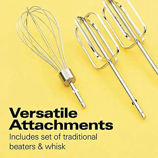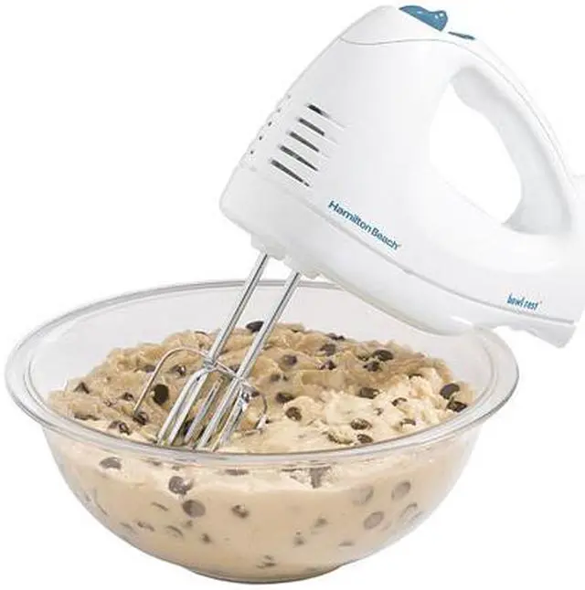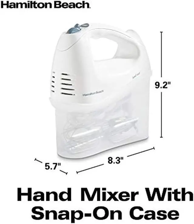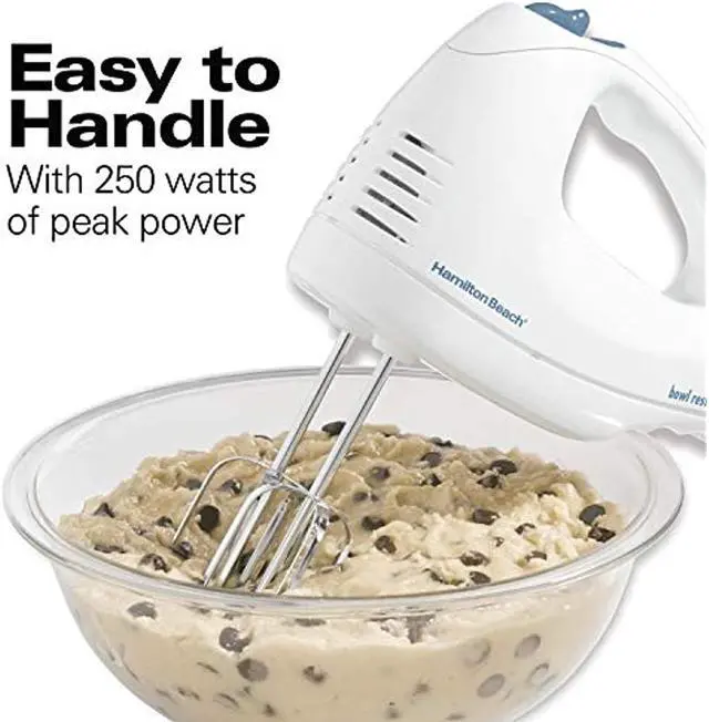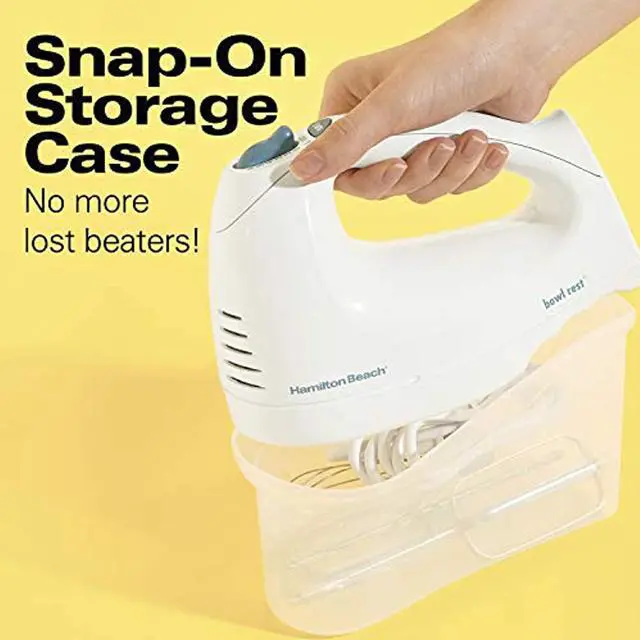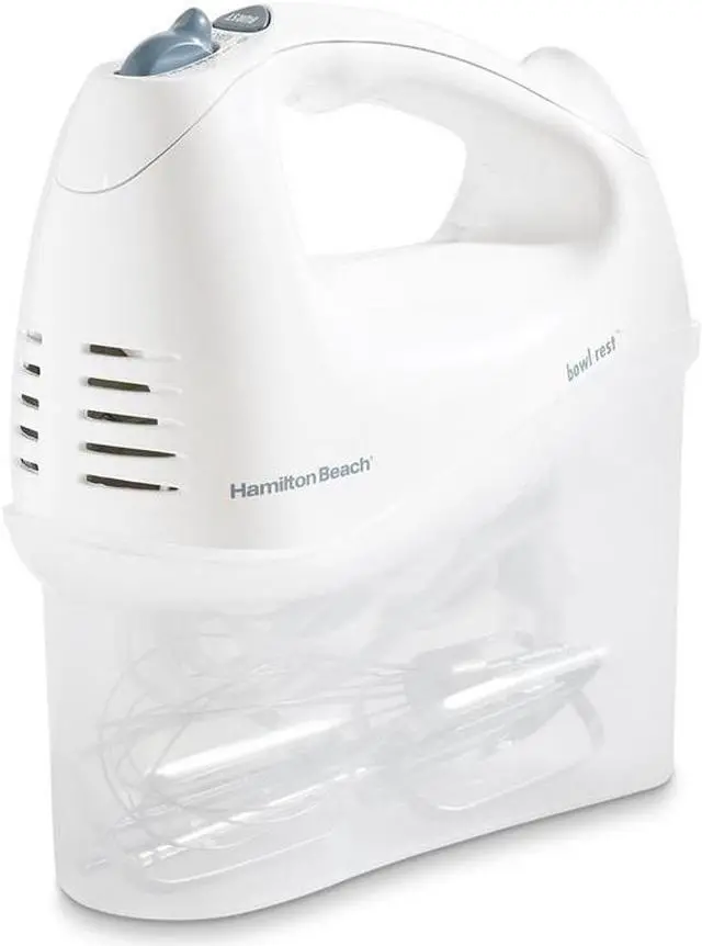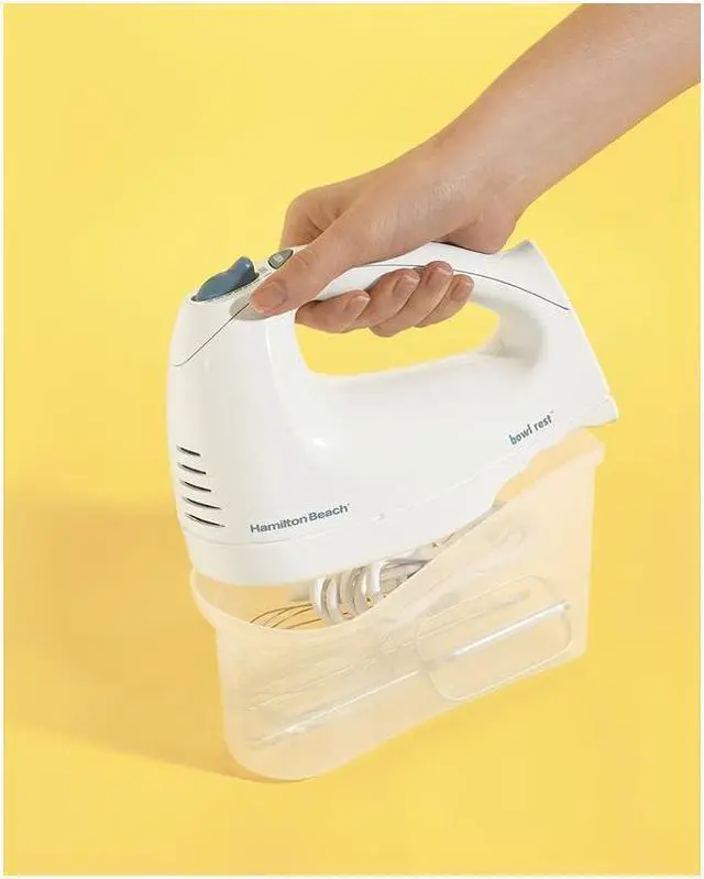 Mix and whip with power, convenience and comfort.Powerful Hamilton Beach Hand Mixers focus on ergonomics and versatility. Handles are built with a comfortable grip in mind. Convenient snap-on storage cases keep attachments together so you don 't have to search for them each time. A variety of attachments are available with different hand mixers, from traditional beaters to wire beaters, whisks and milkshake attachments.Hamilton Beach Hand Mixer handles are designed for control and comfort, and the unique Bowl Rest feature allows the mixer to sit on the edge of the bowl to eliminate messy drips. A special QuickBurst button provides a quick boost of power and can be used for tough tasks at any speed.Snap-on storage case250 Watts peak powerBowl Rest featureSix speeds with QuickBurst buttonTraditional beaters and whisk