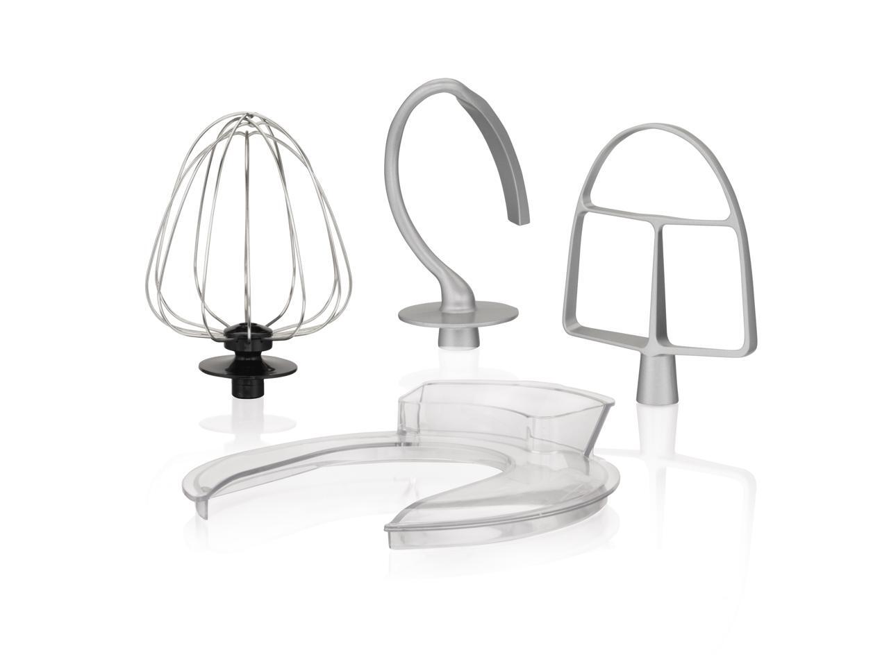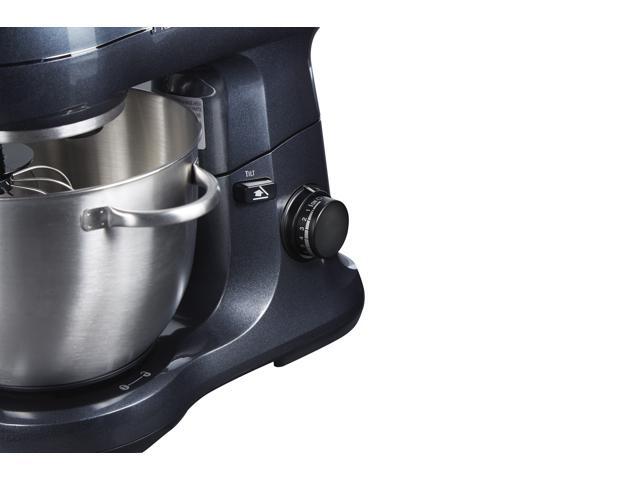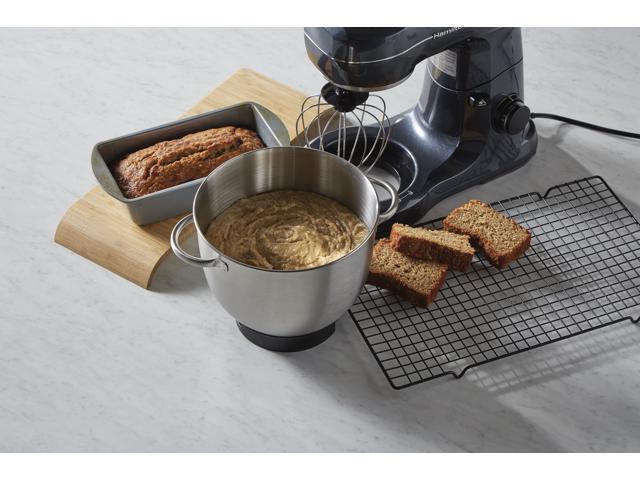 - In addition to the stainless steel bowl with handles, the stand mixer comes with a splash guard, dough hook, whisk and flat beater. The bowl and the stand mixer attachments are all dishwasher safe.