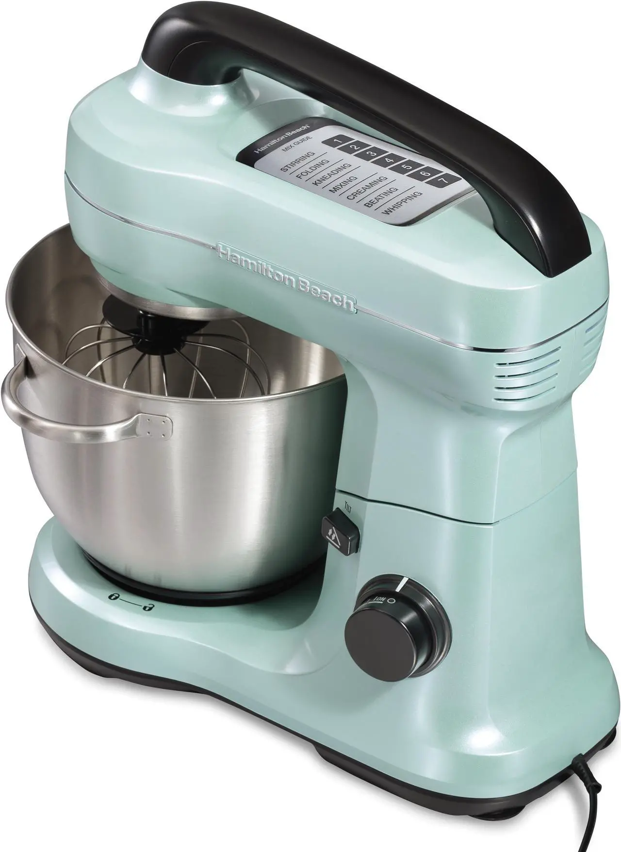 | Features | The Hamilton Beach® Stand Mixer effortlessly mixes ingredients for every baking recipe, from cake batter and frosting to dense bread dough. This versatile stand mixer has 7 speeds and a mixing guide that helps you choose the right speed for the job. Go from slowly folding in ingredients to whipping at top speed with ease. The slow first speed is great for kneading bread and reducing splatter when adding dry ingredients to wet ingredients, and the high speed perfectly whips cream or meringue. The planetary mixing action rotates the beaters around the 4-quart stainless steel bowl for even and complete hands-free mixing. The stand mixer has the same rotating mixing action as the higher-priced brands. Includes a 4 quart stainless steel bowl with handles, whisk, dough hook, flat beater and splash guard, which are all dishwasher safe for easy cleanup. Additional convenient features include a built-in handle at the top to make the mixer easy to lift, move and store and a tilt-back head for easy access to the bowl. Bake with ease Effortlessly mix thick batters and doughs for bread, cookies and more. With a powerful 300 watt motor, this Hamilton Beach stand mixer will easily handle the ingredients for all your homemade baked goods from cupcakes and cookies to bread. Versatile — 7 speeds, slow first speed & mixing guide A helpful guide on top of the electric mixer helps you choose the right speed, and the slow first speed is great for kneading bread and reducing splatter when adding dry ingredients to wet ingredients. Complete bowl coverage The planetary mixing action rotates the beaters around the sides of the 4 quart stainless steel bowl for thorough, hands-free mixing. In addition to the stainless steel bowl with handles, the stand mixer comes with a whisk, dough hook, flat beater and splash guard. The bowl and attachments are dishwasher |