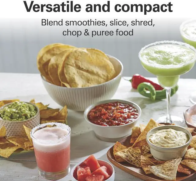 Chop and puree food, blend smoothies, and slice or shred vegetables and cheese with this versatile food processor. Its compact design is perfect for small kitchens.