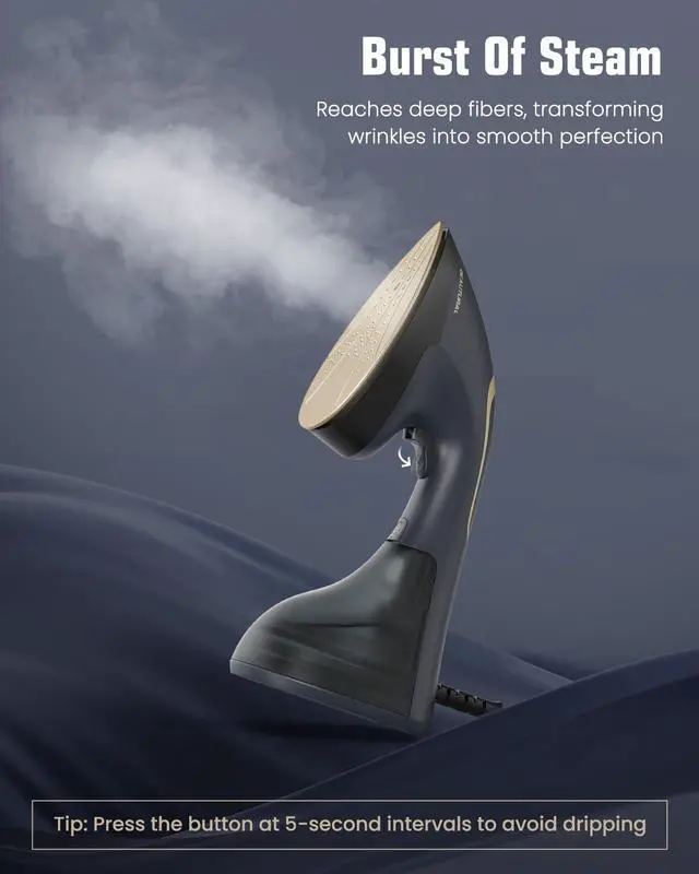 For optimal use, move the steamer over your garment from top to bottom. Use your free hand to keep the fabric taut and stretched. Steam the fabric with slow, downward strokes, keeping the heating plate incontact with the fabric.