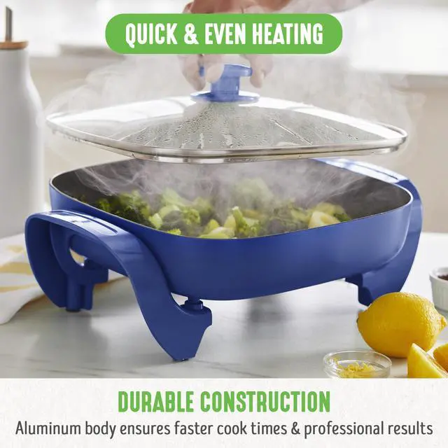 12" 5QT Square Electric Skillet, Glass Vented Lid, Ceramic PFAS-Free Nonstick Coated Interior, Adjustable Temperature Control, Cool Touch Handles, Quick Even Heating, Scratch Resistant, Blue