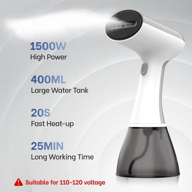 Ultra-Powerful Heating & Rapid Heating & Ultra Large TankThe handheld steamer 1500W ultra-powerful heating and Ultra Large 400ml Water Tank, 20-second rapid heating, powerful steam instantly smooths out wrinkles.Only suitable for 110-120 voltage.