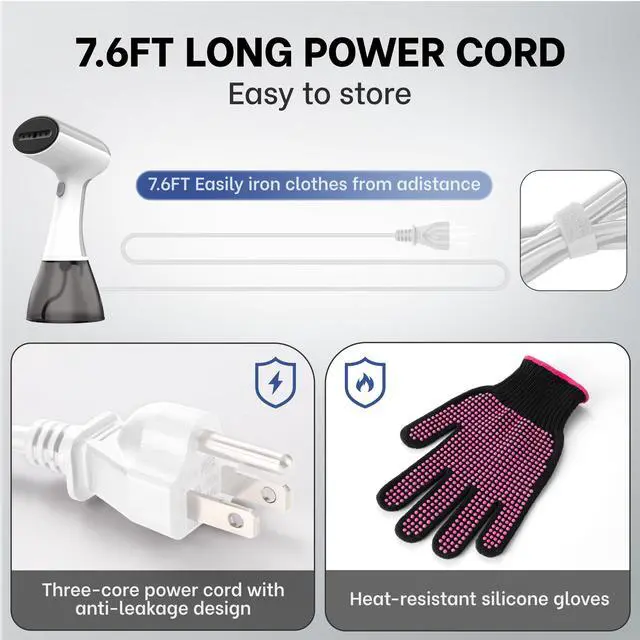 Extended Reach & Long-Lasting Power & Burn-proofThe Steam Iron Features a 7.6-foot(2.3 m) Three-core power cord withanti-leakage design, for ironing clothes from a distance, with up to 25 minutes of continuous useno need to worry about operating range or runtime.Also equipped with heat-resistant silicone gloves, ensuring worry-free ironing of your clothes.