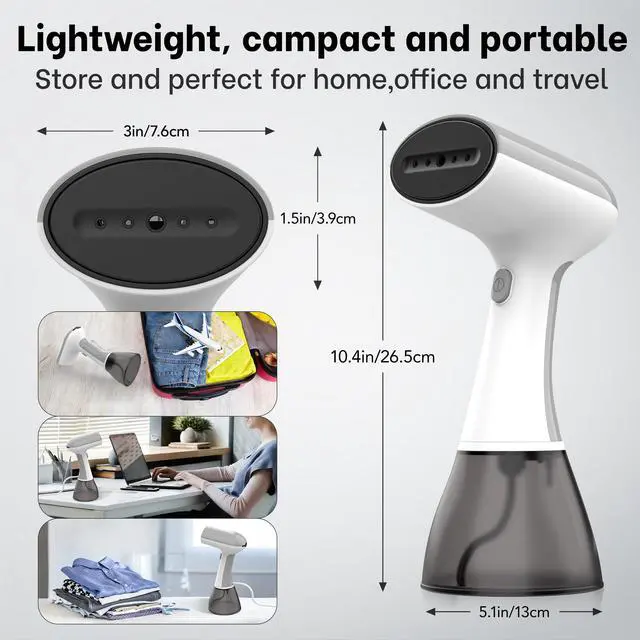 Portable and CompactThis portable garment steamer is lightweight and compact, making it easy to carry. Measuring just 10.4 inches (26.5 cm) in height and 5.1 inches (13 cm) in diameter, it stores conveniently and is perfect for home, office, or travel use.
