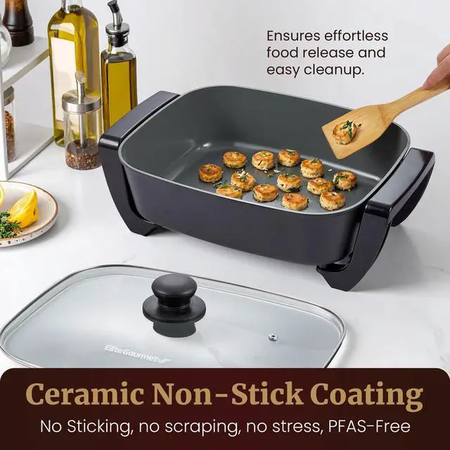 15" x 12" x 4" Electric Skillet, Xtra Deep Dish, Ceralast PFAS Free Ceramic, 1500W Rapid Heat, Tempered Glass Vented Lid, Dishwasher Safe, 12.5 Qt., Black/Gray
