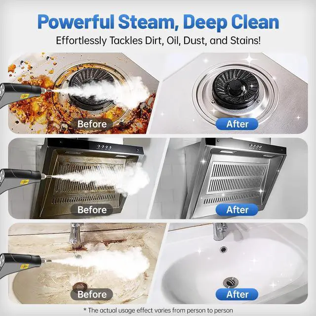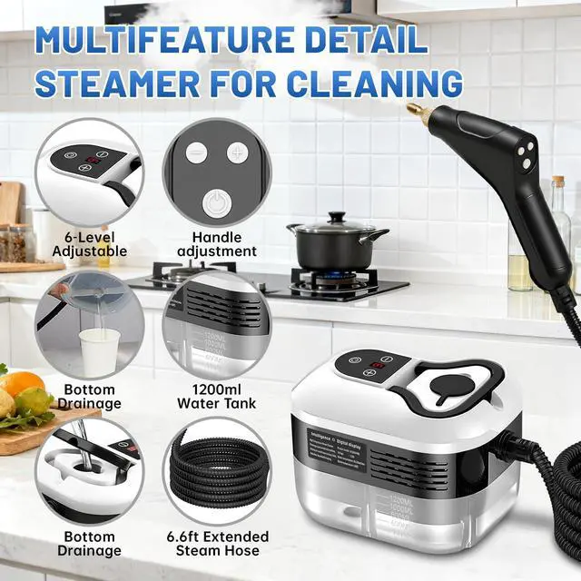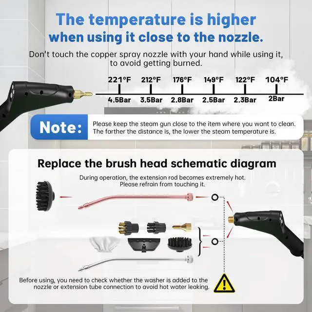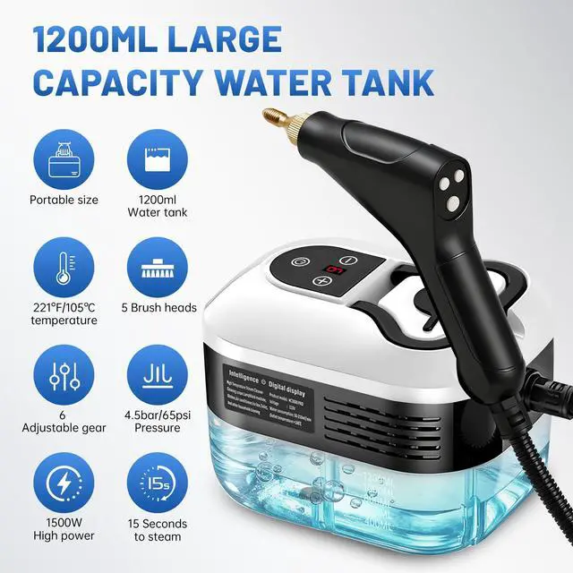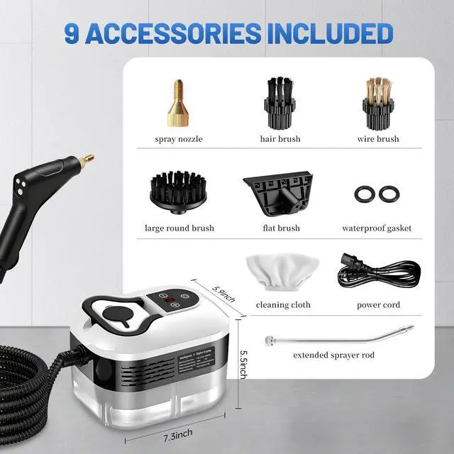 | Included Components | 1 steam cleaner handheld, 1 extension nozzle, 1 nylon brush, 1 high-pressure nozzle, 1 brass brush, 1 extended sprayer rod, 2 sealing ring, 1 cleaning cloth sleeve, 1 clearing needle, 1 floor cleaning brush, 1 small scraper, 1 large scraper, 1 user manual, 1 bottom waterproof plug |
