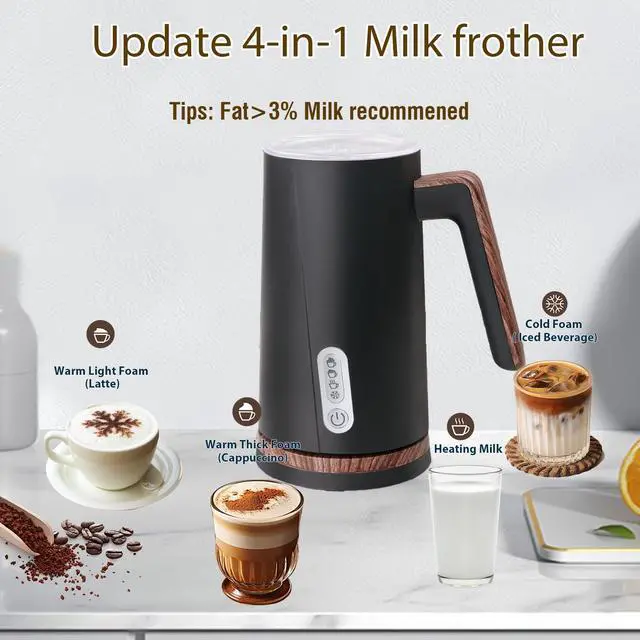Updated 4-in-1 Electric Milk Frother The NESSGRAIM electric milk frother offers 4 functions in one device: dense hot foam, airy hot foam, cold foam, and a milk warmer without foam. Perfect for making your favorite coffee specialties like cappuccino, latte macchiato, or just hot milk at home. The stylish vintage wood handle complements any modern or classic kitchen decor.