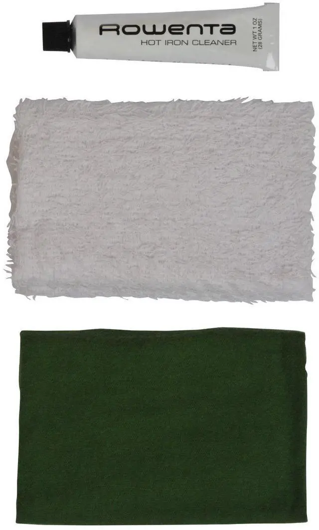 The rowenta zd100 soleplate cleaning kit contains a specially formulated cream that cleans soleplates by removing the draggy coating caused by excess starch, detergent build up and burned on synthetics. It is also ideal at removing melted webs, fusibles, iron on interfacings and trims. The cleaning kit is appropriate on all types of soleplates. Kit contains: 1-ounce tube of soleplate cleaner; application cloth; polishing /finishing cloth and set of instructions.