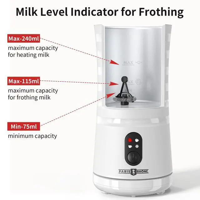 For foaming, the minimum is 75ml/2.5oz and the maximum is 115ml/3.9oz. For heating milk, the minimum is 75ml/2.5oz and the maximum is 240ml/8.1oz. To prevent overflow and ensure proper operation, make sure to add milk according to the marked line.
