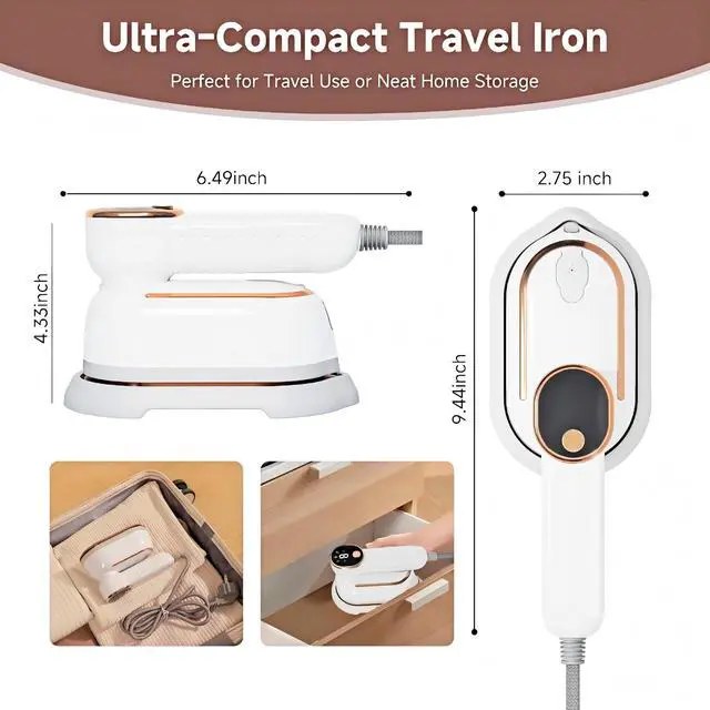 This travel steam iron is more compact and lighter than standard irons, measuring just 6.5in*4.5in*3.86in(16.5cm×11.5cm×9.8cm) and weighing only 1.54lb(0.7kg), easily fitting into travel backpacks or luggage compartments
