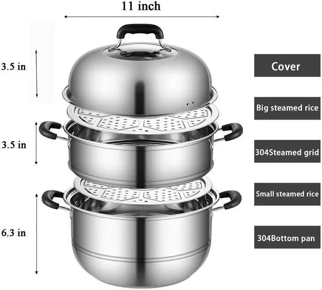 What will you get? Includes a large saucepan (30cm x 17cm-12’’ x 6.7’’), 1 steamer (30cm x 9cm-12’’ x 3.5’’), 2 septa and a lid (30cm x 14cm-12’’ x 5.5’’), enough to make meals for 4-6 people. Multi-purpose use, boiling soup, steaming vegetables, steaming fish, etc.