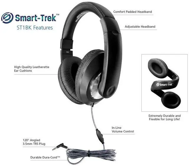The durable and sleek Smart-Trek Deluxe headphones are versatile and compatible with a wide variety of technologies. They feature a rugged and comfortable design, so teachers can have the headphones that will function for years and students can wear the headphones for an extended period of time. The adjustable headband snaps easily into place to fit students of all ages.