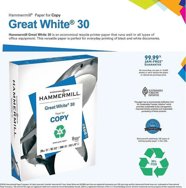 Print profit and loss statements, payroll reports and daily inventory sheets with this Hammermill Great White 30 percent recycled copy paper. The 20-pound paper weight provides an ideal option for everyday printing, and a brightness rating of 92 delivers a striking contrast for monochrome text. This Hammermill Great White 30 percent recycled copy paper is SFI-certified for an environmentally responsible approach to office paperwork.