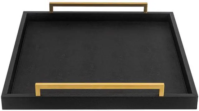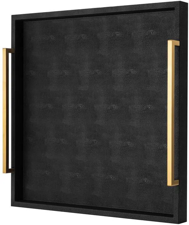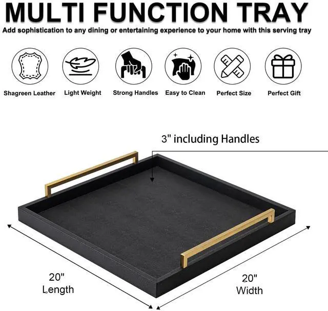 Introducing our large ottoman tray for coffee Table, a stunning addition to any living space. Featuring a square design with elegant brushed gold handles, this tray exudes sophistication and style. Constructed from 12mm thick medium density fiberboard and covered in durable Shagreen leather, this tray is not only stylish but also incredibly sturdy. The sturdy brushed gold handles provide a comfortable and secure grip, making it easy to transport and serve food and drinks. Versatile and stylish, this serving tray is the perfect addition to your living room, kitchen, bedroom, or bathroom. Its spill-resistant design means that any accidents can be easily cleaned with just a damp cloth or sponge, saving you time and effort. Elevate your home decor with this stylish and functional large decorative tray. Add a touch of elegance to your space and impress your guests with this exquisite ottoman tray.