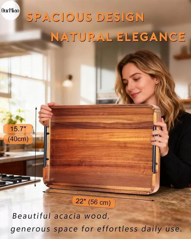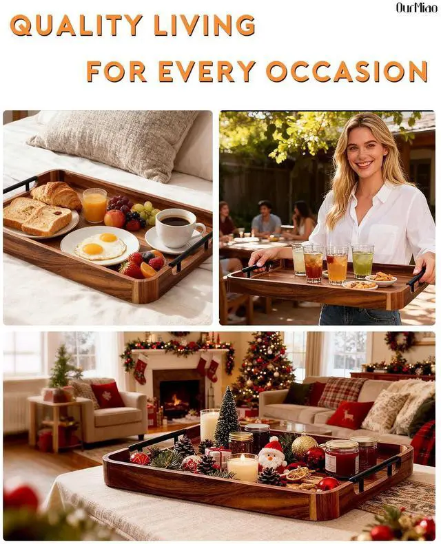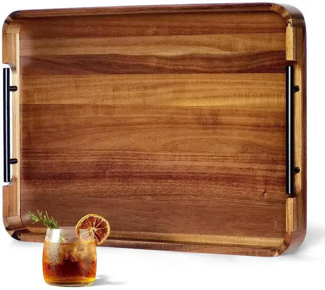 OurMiao Acacia Wood Ottoman Tray 22x15.7 Inches, Large Rectangle Wooden Serving Tray with Metal Handles