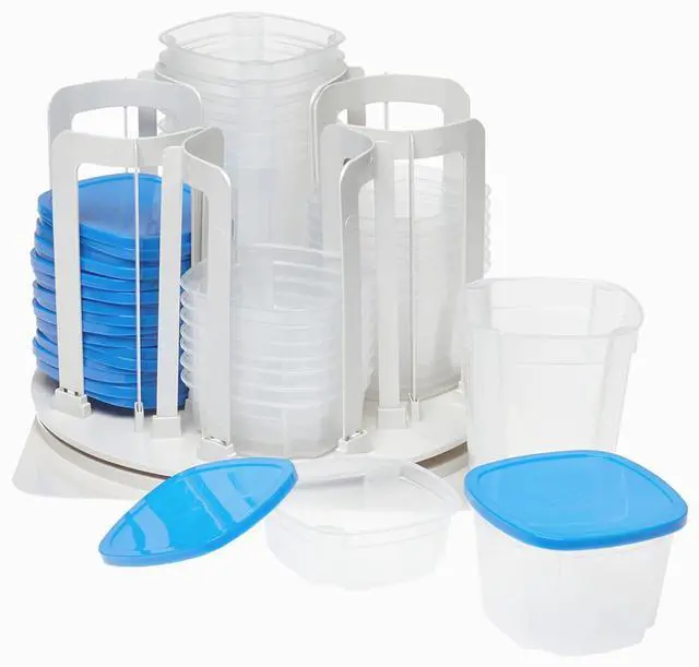 Spin and Store Swirling Organizer Handle all your kitchen needs in the space you reserve for your coffee maker with the Storage Carousel. Never worry about fumbling with lids again with the same size locking lids. Containers fit on a spinning carousel to help you easily find your desired bowl. Features 8 by 8 oz Clear Containers 8 by 16 oz Clear Containers and 8 by 24 oz Clear Containers and 24 lids. Each bowl features measuring marks on the side. Bowls are microwave safe. Features and Benefits Clear Containers Make It Easy To See What Each One Holds Same Size Locking Lids red or blue Makes It Easy To Find The Right Size Lid Every Time Great For The Office Garage Or Refrigerator Takes Up About A Cubic Foot Of Space Includes Carousel Holder 8 by 8 oz Clear Containers 8 by 16 oz Clear Containers 8 by 24 oz Clear Containers 24 Locking Lids
