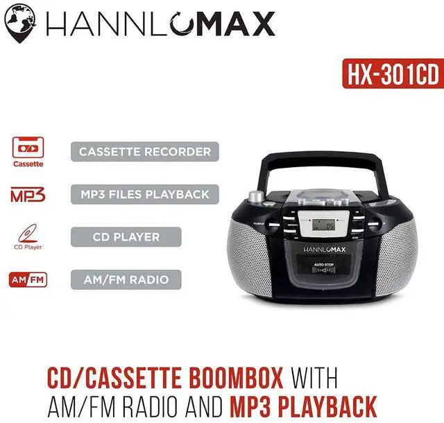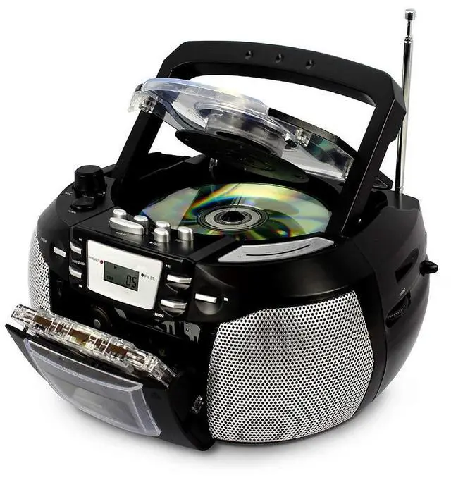 Portable CD Player, AM/FM Radio, Cassette Recorder, Records from CD or Radio, Headphone Jack, AC/DC dual power source.