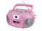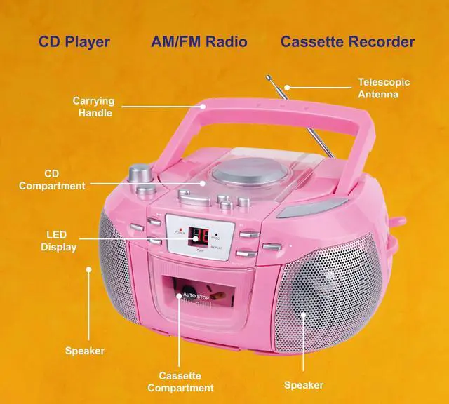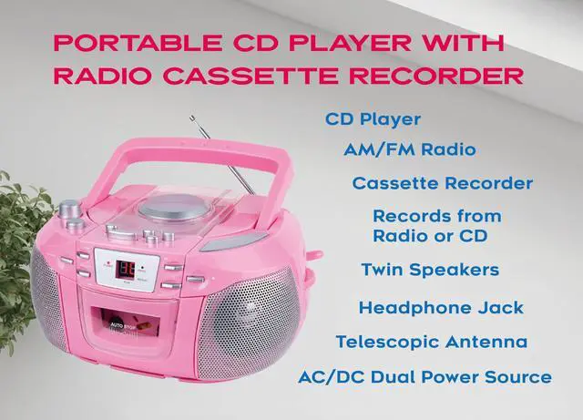 Portable CD Boombox, AM/FM Radio, Cassette Recorder, Records from CD or Radio, Headphone Jack, LED Display, AC/DC Dual Power Source.
