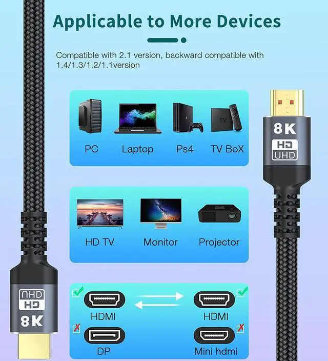 With dynamic HDR technology, you will experience a wider color gamut, brighter picture, more obvious brightness and more delicate picture contrast from this 8K HDMI Cable