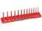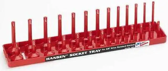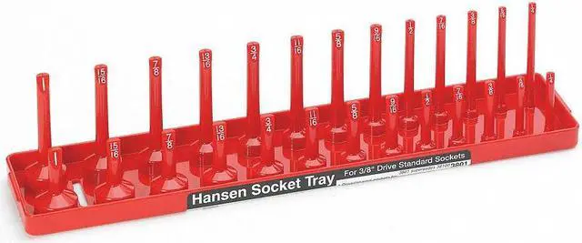 Red, Socket Tray, Plastic, 3 in Overall Width, 13 1/4 in Overall Depth, 3 in Overall Height, For Socket Size/Type 3/8 in, Includes End Tangs End Tangs Included, Number of Handles 0, Number of Posts/Slots 26, Number of Rows 2, Number of Trays 1. This item has been restricted from sale in the following state (s): []