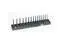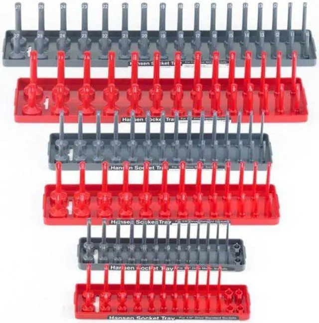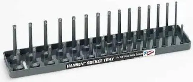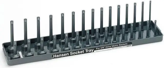 The Hansen 3/8 in. Dr., Metric, Standard and Deep Socket Tray is the perfect solution for keeping your tools organised. You will be able to carry your tools around with ease. The socket tray has end tangs that allow you to pick out of tight tool boxes easily. Sizes are marked on top of posts so you can find the right size quickly and easily. This standard/deep socket tray measures 13 1/4 in. in length, 3 in. in height and 3 in. width respectively, while having an overall depth of 13 1/4 inches.
