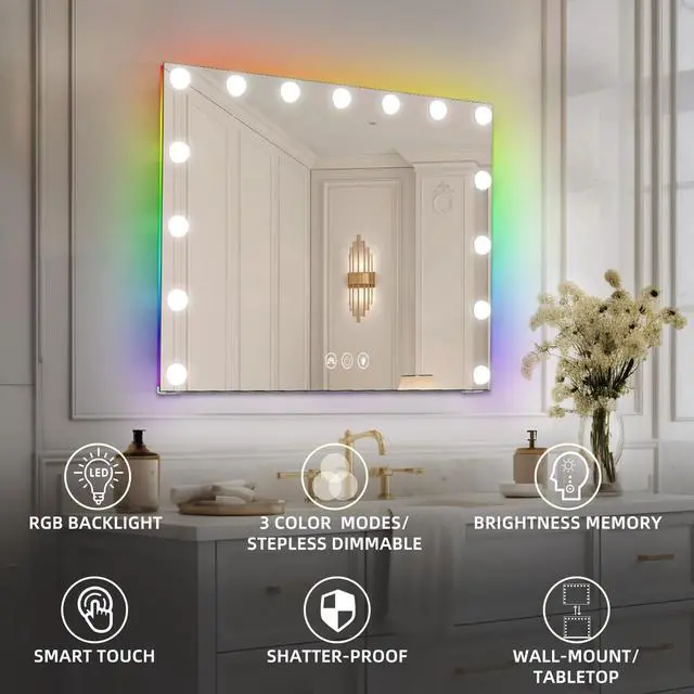 Vanity Mirror with RGB Lights, 22.8" x 18.1" Hollywood Mirror, Makeup Mirror with 15 Dimmable Bulbs and 10X Magnification, 3 Colors Modes, Touch Control, USB Charging Port big vanity mirror with lights lighted makeup mirror with light led mirror vanity hollywood mirror with light makeup vanity mirror and lights espejo con luces mirrors for vanity wall mount makeup mirror for desk light up mirror