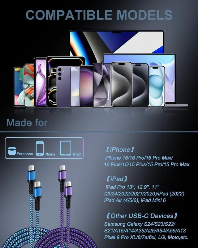 | Compatible Phone Manufacturer | iPhone: 17e, 17 Pro Max, 17Pro, 17, Air, 16e, 16 Pro Max, 16 Pro, 16 Plus,16, 15 Pro Max, 15 Pro, 15 Plus, 15; Google Pixel: 10 Pro XL, 10 Pro, 10, 10 Pro Fold, 9a, 9 Pro XL, 9 Pro, 9, 9 Fold, 8 Pro, 8a, 7 Pro, 7a, 6 Pro, 6, 5a 5G; Motorola: Moto G Power, G Stylus, G 5G, G Pure, Razr, Edge; Samsung Galaxy: S26 Ulra, S26+, S26, S25 Edge, S25 Ultra, S25+, S24 FE, S24 Ultra, S24+, S23, Z Fold/Flip (7-3), A17, A 16 5G, A36, A15, A35, Tab S9, Note 20; Others: Xiaomi, Oneplus, HTC, Blackberry, PS6/5, Xbox, Kindle Fire, Power Bank, Wireless Charger and more |