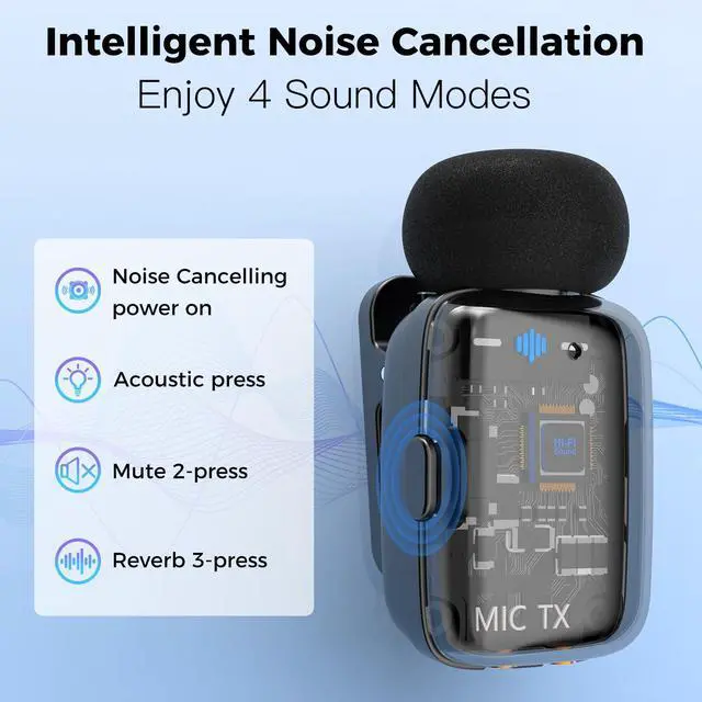 Switch modes easily to suit different scenes: Noise Reduction for clear vocals, Original Sound for natural tone, Mute for pauses, and 3D Reverb for a studio-like effect. Each mic captures rich, stable audio up to 100 m away.