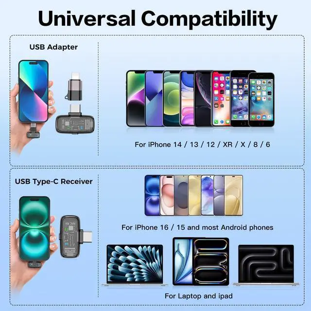 With Lightning and USB-C connectors, this mic works with iPhone, iPad, Android phones, tablets, and laptops. Just plug in the receiverno apps or Bluetooth neededand start recording instantly.